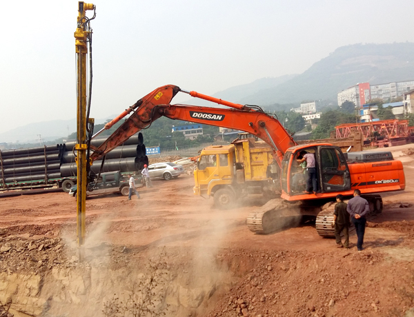 2、前后左右自由伸展,當(dāng)挖掘機(jī)在工地不平坦的情況下, 挖機(jī)手可根據(jù)位置不同調(diào)整鉆桿角度,保持90°垂直鉆孔。